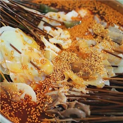 钵钵鸡的诞生与乐山三江交汇的码头文化密不可分,据说清末民初,船工们为快速补充体力,将煮熟的鸡肉串浸入盛满调料的瓦罐中,即取即食,方便快捷,于是在码头集市流行开来。味道好,自然可以做延展,万物皆可入钵,鸡肉便不再是唯一的主角。